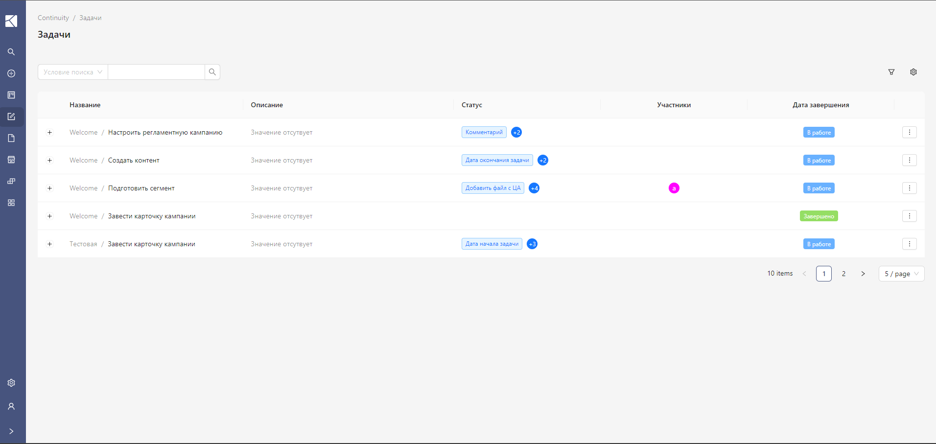 Заведение задач на разработку отдельных частей маркетинговой кампании: подготовка брифа, сегмента, креативов, текстов коммуникации и т. д. Назначение ответственных и согласующих на каждую задачу и сроков исполнения