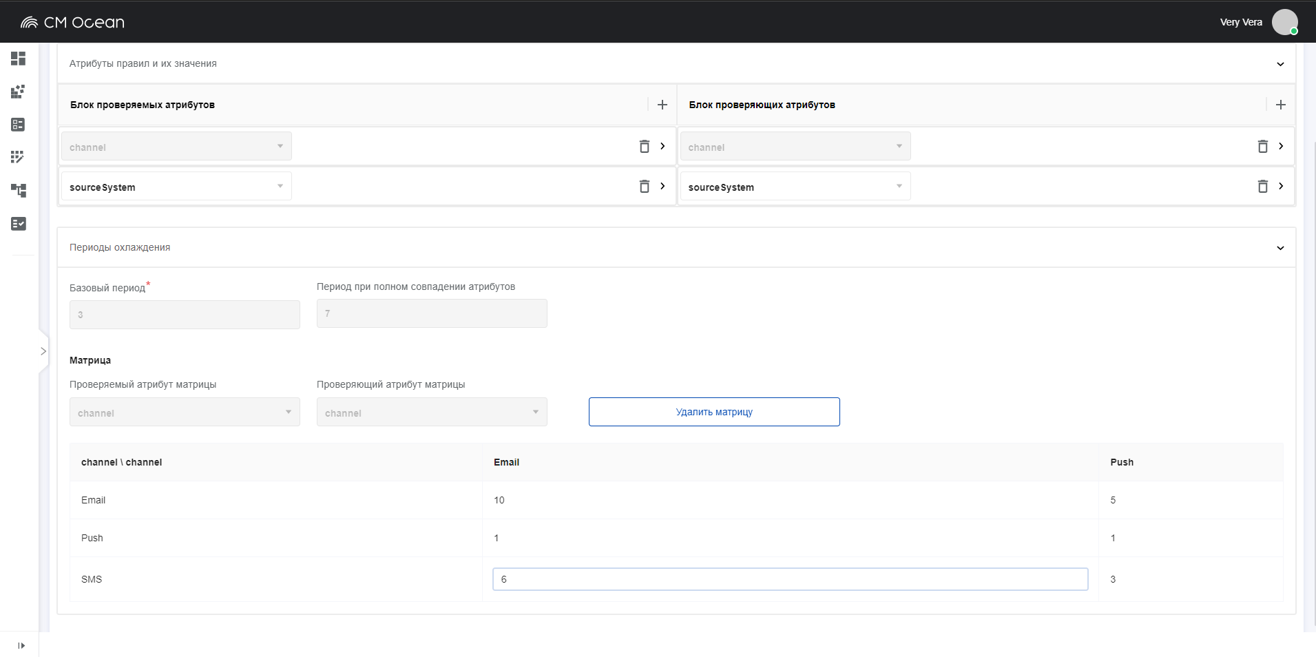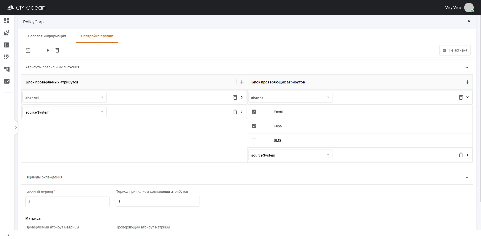 Настройка может вестись в любых разрезах. Это не только канал, продукт и кампания. При установке модуля настраивается список атрибутов коммуникаций, участвующих в проверках. Все они будут достпны для применения в правилах